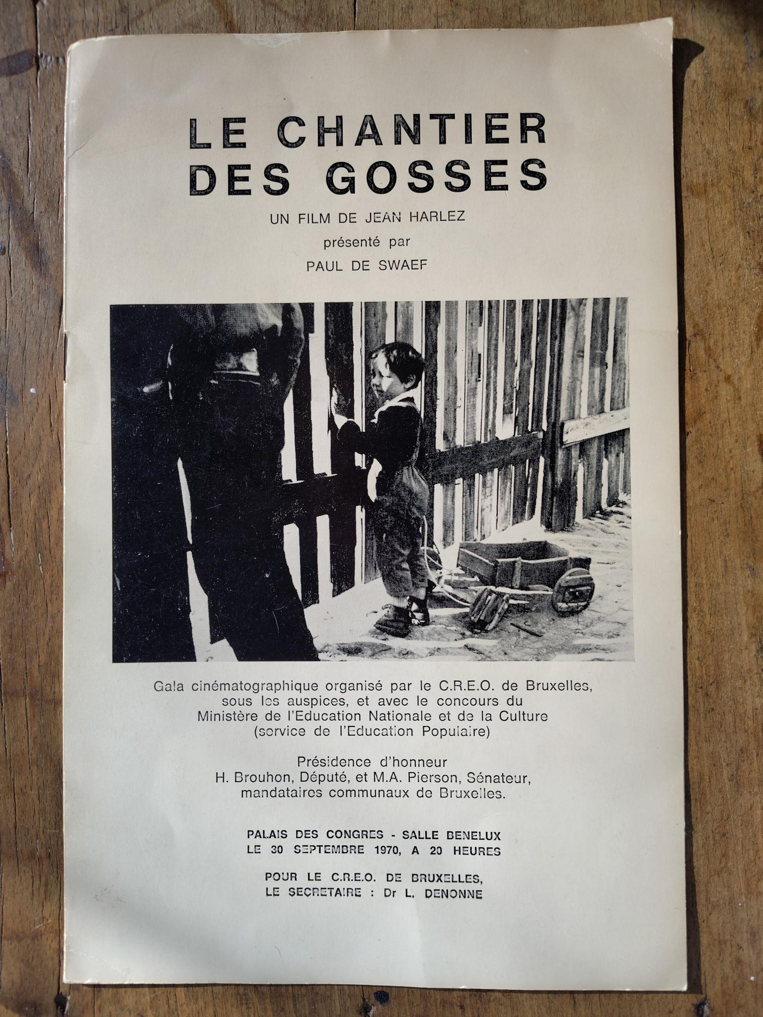 Tourné avec des moyens de fortune, sans son direct, « Le chantier des gosses » devra attendre plus de 15 ans avant d’obtenir les moyens d’être sonorisé. Et encore… « l’aubaine » viendra d’une commande du ministère de l’Education nationale, souhaitant une version réduite du film pour illustrer des cours de morale, qu’il financera modestement, permettant tout juste à Harlez de sonoriser la version longue. « Le chantier des gosses » verra ainsi le jour en 1970, grâce à beaucoup d’enthousiasme, de patience et d’acharnement. Mais, en l’absence d’aides ou de distribution, il passera inaperçu du grand public et sera ignoré par la plupart des filmographies et des ouvrages sur le cinéma belge. Il ne sera quasiment plus projeté après son avant-première au Palais des Congrès le 30 septembre 1970, et un passage à la TV l’année suivante.