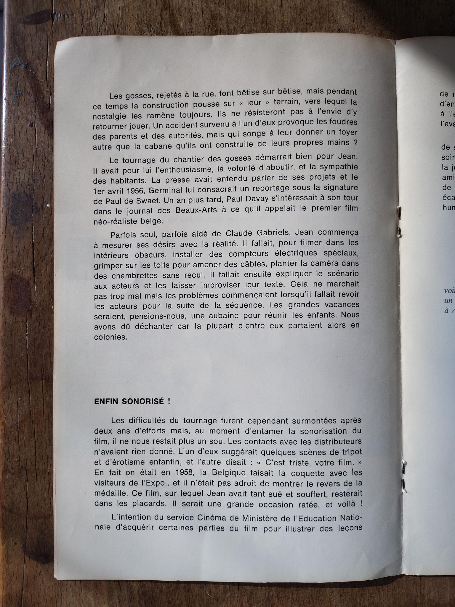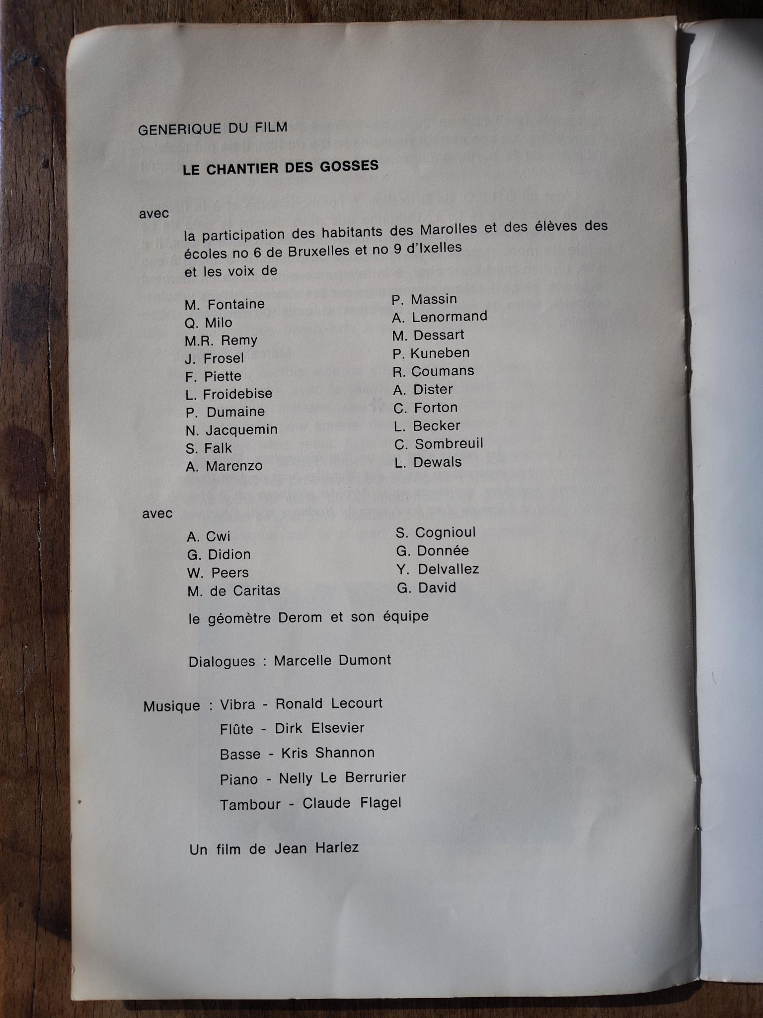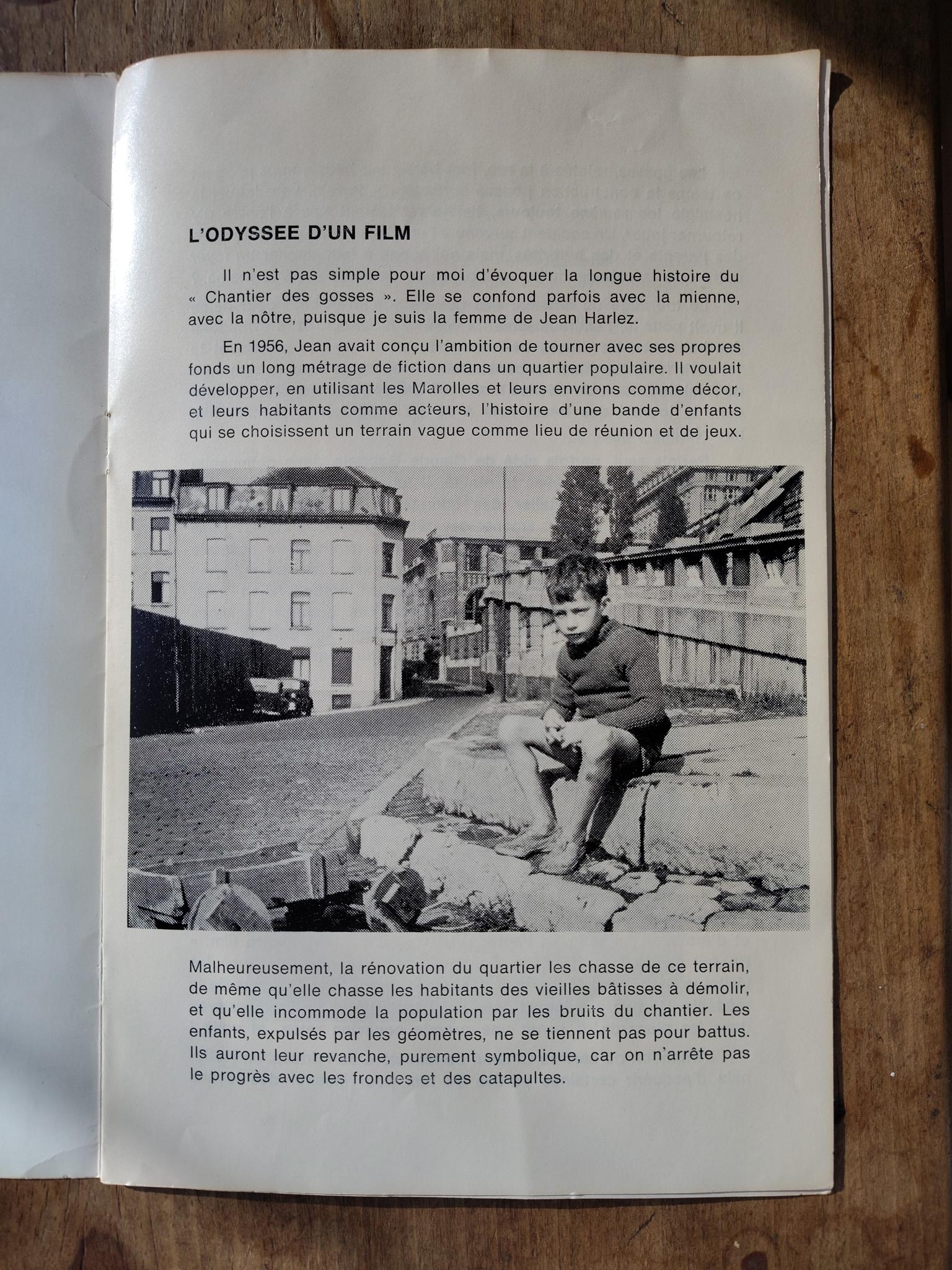 Considéré comme « un sauvage du cinéma belge », un « possédé de cinéma », Jean Harlez est un autodidacte qui évolue en marge des milieux professionnels. Fils de forgeron, mécanicien de formation, il arrive au cinéma dès 1947 comme assistant de Charles Dekeukeleire. Après un passage par le chômage et les petits boulots, Jean Harlez se fabrique une caméra 35mm et réalise un court-métrage sur une coopérative agricole, sans argent, ni soutien d’aucune sorte. Coup de pot, le ministère de l’Agriculture le lui achète. Il peut dès lors réaliser son rêve : « tourner un vrai grand film ». Faire du cinéma en se mêlant à la vie, dans la rue, avec des gens de la rue. Montrer la vie « dans un quartier pauvre que rien ne distinguera des autres quartiers pauvres du monde ». Harlez s’en va sillonner les rues des Marolles pendant deux ans (1954-1956). Il s’attire rapidement la sympathie des habitants et s’entoure d’une kyrielle d’enfants qui deviennent peu à peu ses acteurs…