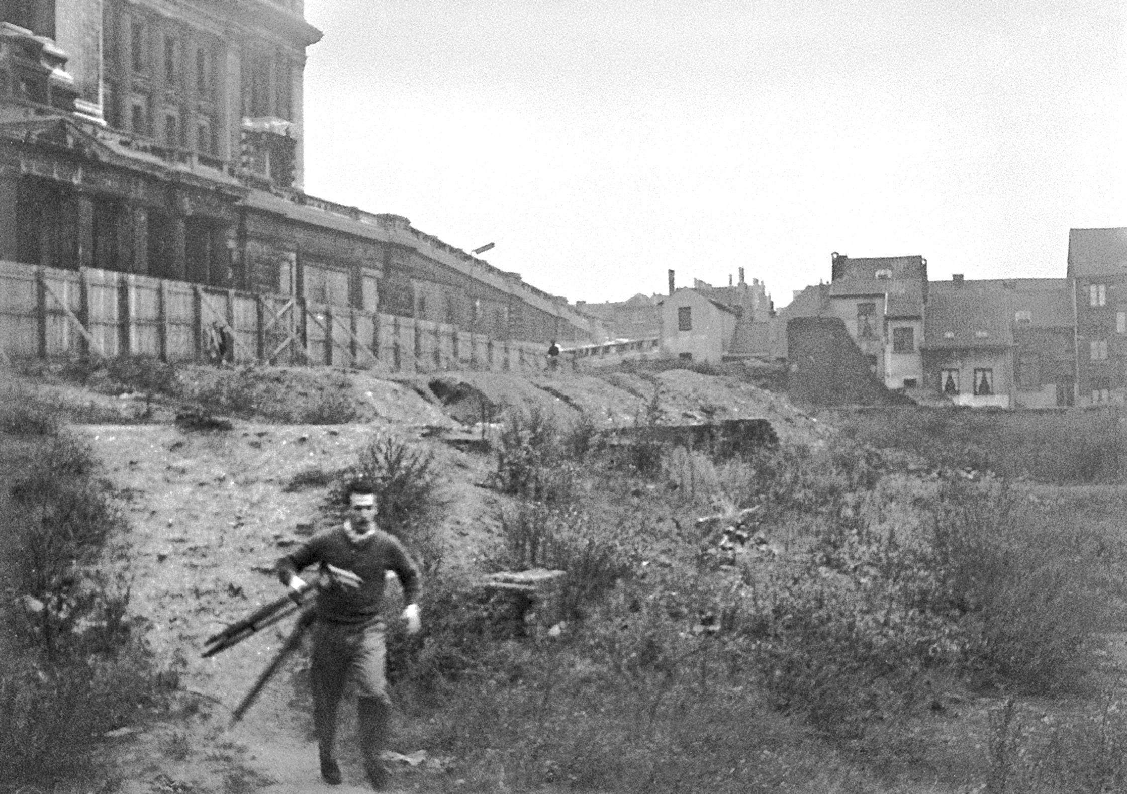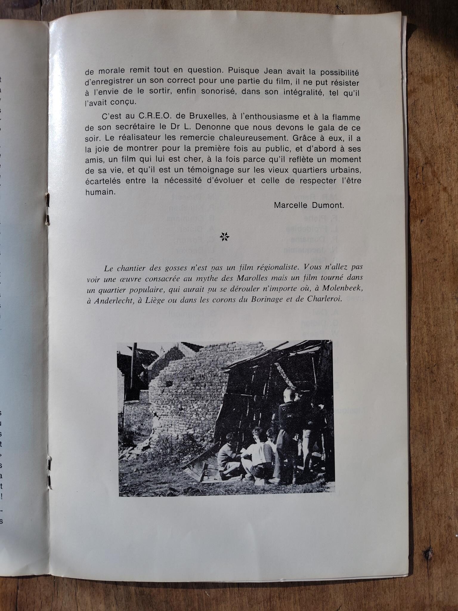 « Le chantier des gosses » est le fruit de cette aventure. Première du genre à Bruxelles, la démarche enthousiasme la presse. Il s’agit sans doute du premier long métrage belge inspiré par le néo-réalisme, cinq ans avant « Déjà s’envole la fleur maigre » de Paul Meyer. Mais les ministères s’en fichent. Nous sommes juste avant 1958 et la Belgique s’apprête à faire la coquette avec l’Exposition universelle. Il n’est pas de bon ton de montrer les impasses « glaireuses » d’un quartier « populeux » en plein cœur de la capitale. Encore moins si le film s’intéresse à un terrain vague, laissé béant depuis la chute d’un missile V1 à la fin de la Seconde Guerre Mondiale (qui a notamment détruit le Théâtre de Toone), entouré de vieilles bicoques de tôle ondulée, de palissades aveugles et constituant l’avant-plan d’un panorama qu’il s’agit de rendre rapidement plus présentable au regard des touristes qui ne manqueront pas de venir en masse admirer la vue depuis le Palais de Justice.