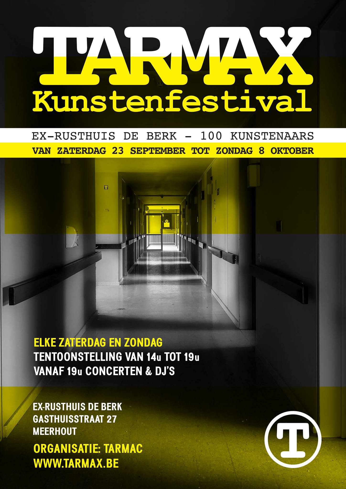 Vanaf zaterdag 23 september is Tarmac 3 weken lang te gast in het oude Rusthuis De Berk in Meerhout. TarmaX is een groot cultureel feest dat drie weekends lang duurt en waar meer dan 100 hedendaagse kunstenaars en een paar uitzonderlijk fijne bands en DJ’s samen komen voor één gigantisch onoverzichtelijk festival.